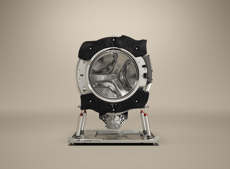 Смысл системы: перенести «силовую» часть машины на жёсткую раму с четырьмя амортизаторами и изолировать её от внешних панелей. Это снижает вибрации и гул, а также стабилизирует отжим.
